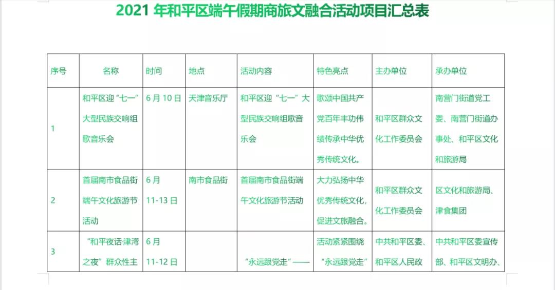 6月11日-13日推出“首届南市食品街端午文化旅游节”,重点以粽香文化特色活动,弘扬端午文化及爱国情怀。节日期间和平区文旅局将在食品街搭台推出高雅时尚文化演出,让广大群众零距离感受高雅艺术。