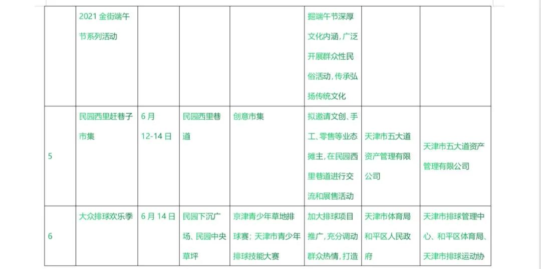 五大道管委会于6月12日-14日在民园下沉广场举办大众排球欢乐季活动,加大排球项目推广,打造特色运动展览品牌;在民园西里巷道举办民园西里赶巷子市集活动。